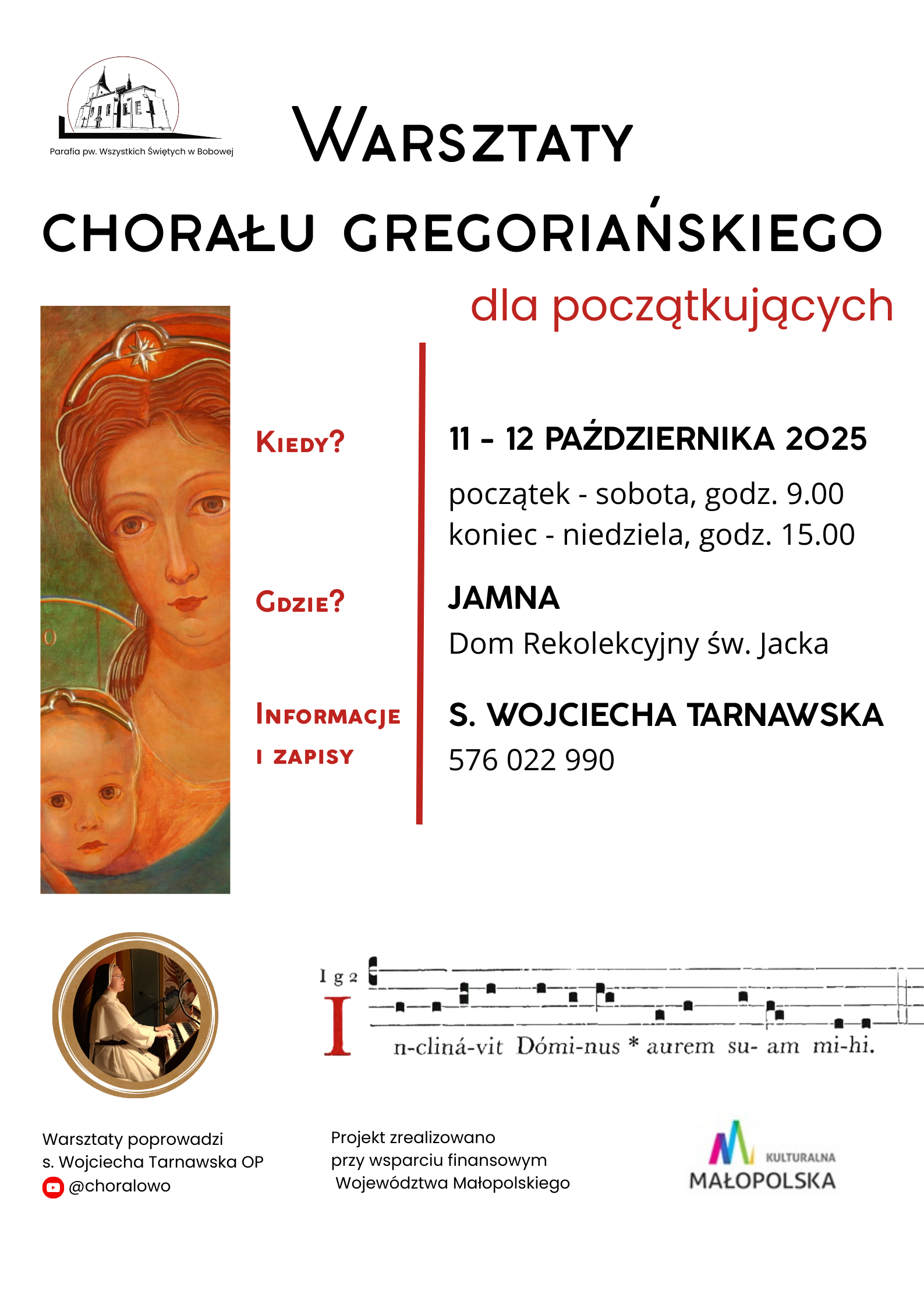 W dniach 11-12.10.2025 r. odbędą się „Warsztaty chorału gregoriańskiego”. Będą to dwudniowe warsztaty dla chóru Cantate Deo i potencjalnych nowych członków chóru prowadzone przez wykwalifikowanego trenera wokalnego w Domu Rekolekcyjnym św. Jacka w Jamnej. Zwieńczeniem warsztatów będzie koncert prezentujący chorał gregoriański wykonany podczas liturgii Mszy Świętej w Kościele pw. Wszystkich Świętych w Bobowej w dniu 12 października, godz. 14.00.